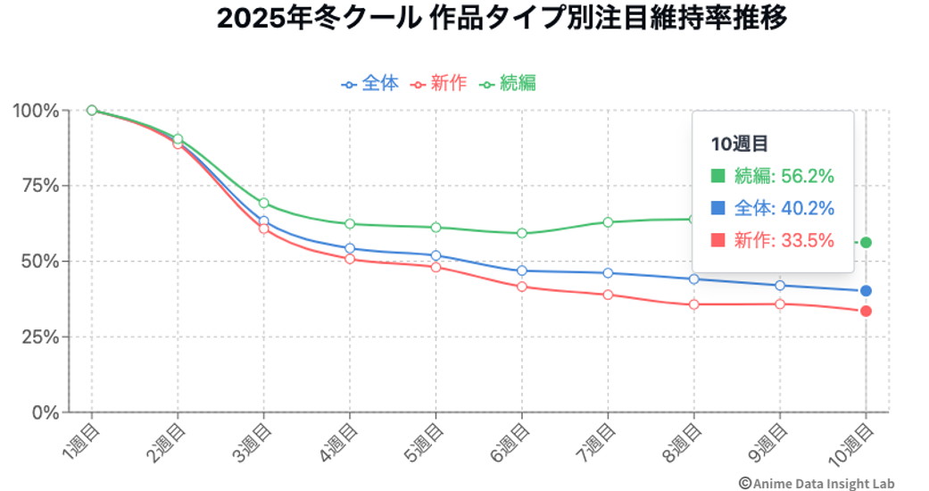 続編アニメについては、10週目時点でも56.2%と比較的高い維持率を示している。これは新作アニメの33.5%と比較すると大きな差があり、既存ファンの支持を得やすい続編作品の強みが表れている。