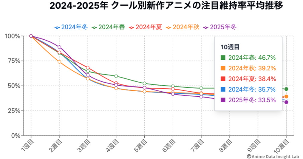 一方で、多くの作品は6週目以降に視聴者の関心を急速に失っており、初動での話題性がそのまま長期的な成功につながるとは限らないことが示された。全体としての維持率が10週目で33.5%と過去1年間の中で最も低い水準になっていることからも、視聴者の選別がより厳しくなっていることがうかがえる。