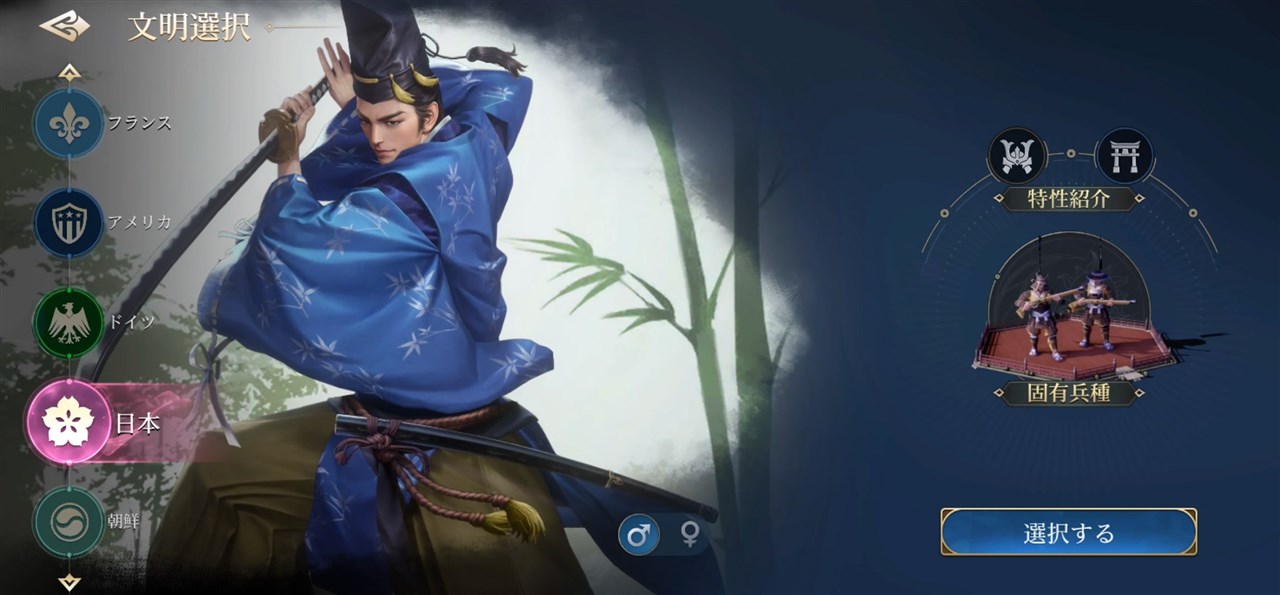 プレイヤーは9つの文明から自分の好みに合わせて選択することができる。登場する文明は、日本、ギリシャ、中国、エジプト、イギリス、フランス、アメリカ、ドイツ、韓国。各文明には固有のパッシブ効果が設定されており、これらの特性を活かした戦術的なプレイが可能だ。