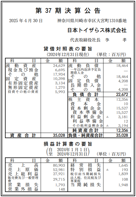 日本トイザらスの2024年12月期(第37期)の決算は、売上高809億0300万円(前の期比8.6%減)、営業損失17億9300万円(前の期は56億3300万円の損失計上)、経常損失16億4500万円(同58億1900万円の損失計上)、最終損失19億4800万円(同69億0200万円の損失計上)だった。4月30日付の『官報』に掲載された「決算公告」で判明した。