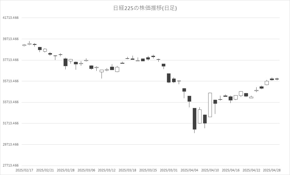 4月30日前場の東京株式市場は5日続伸。日経平均株価は、前営業日比62円52銭高の3万5902円51銭で午前中の取引を終えた。前日の米国株高を受けて買い優勢で始まり、一時183円25銭高の3万6023円24銭まで買われたものの、日米間税交渉や月末月初の経済指標の発表を控えていることから様子見ムードが広がり、3万5800円前後でもみあいとなった。