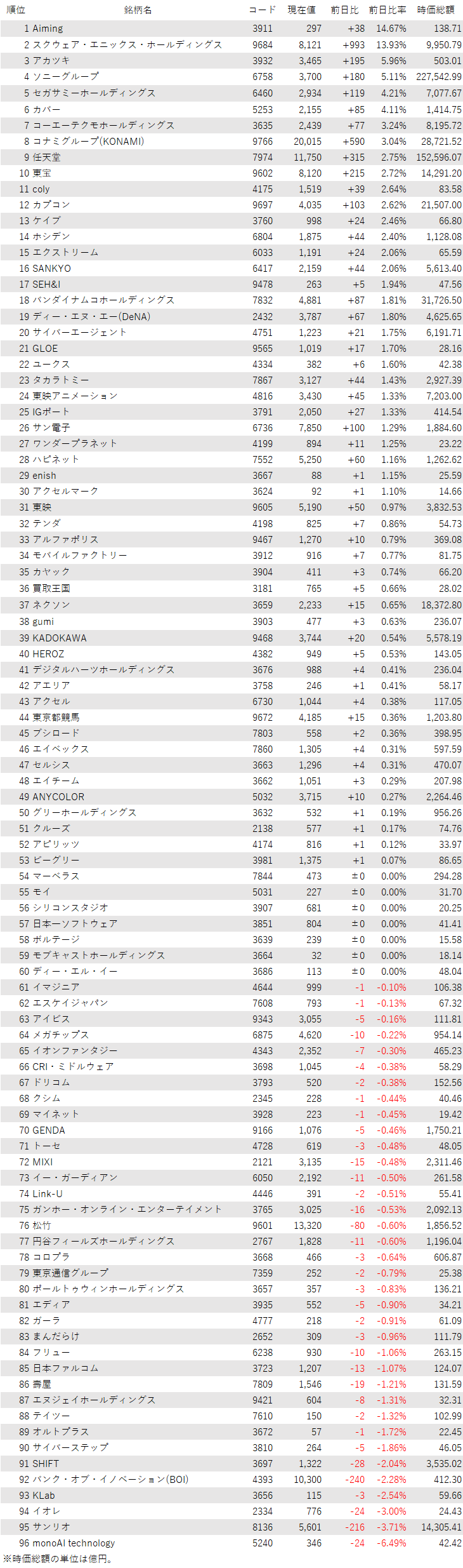 個別銘柄では、Aiming<3911>やスクウェア・エニックス・ホールディングス<9684>、アカツキ<3932>、ソニーグループ<6758>が買われた一方、monoAI technology<5240>、サンリオ<8136>、イオレ<2334>、KLab<3656>が売られた。