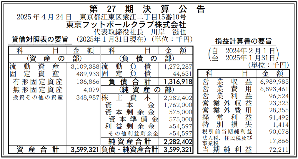 東京フットボールクラブの2025年1月期(第27期)の決算は、営業収益69億8900万円(前の期比17.9%増)、営業利益9600万円(前の期は9600万円の損失計上)、経常利益9100万円(同7200万円の損失計上)、最終利益7200万円(同2億2800万円の損失計上)と黒字転換を達成した。4月30日付の『官報』に掲載された「決算公告」で判明した。