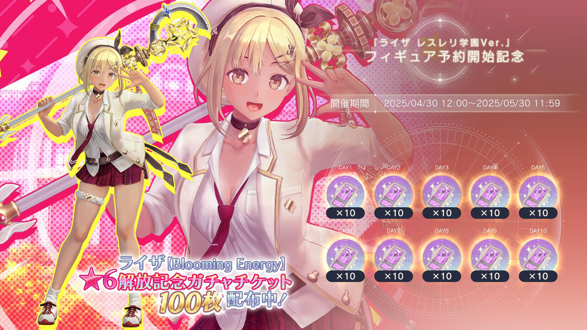 ライザ【Blooming Energy】★6解放記念ガチャチケットが獲得できる『「ライザ レスレリ学園Ver.」フィギュア予約開始記念 LOGIN BONUS」』が開催中。開催期間中に合計10日ログインすることで、最大でライザ【Blooming Energy】★6解放記念ガチャチケットが100枚獲得できる。