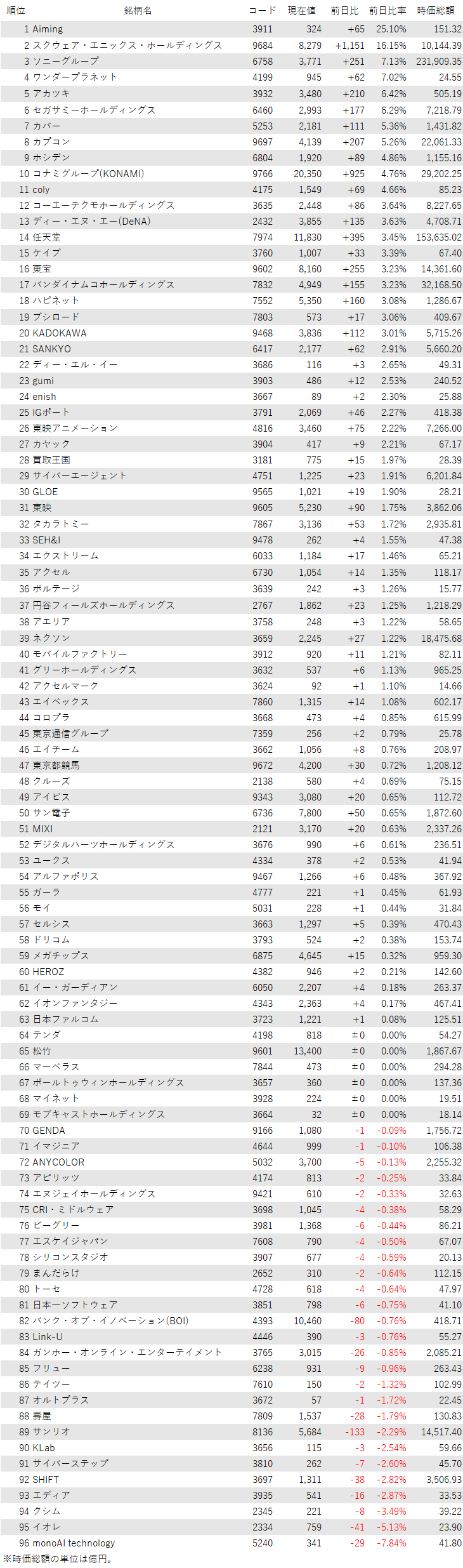 そうした中でゲーム・エンタメ関連株の動きを見てみると、下記の表に登録しているゲーム・エンタメ関連企業96銘柄のうち、上昇は63銘柄(66%)、下落は27銘柄(28%)、変わらずは6銘柄(6%)で、上昇した銘柄のほうが多かった。