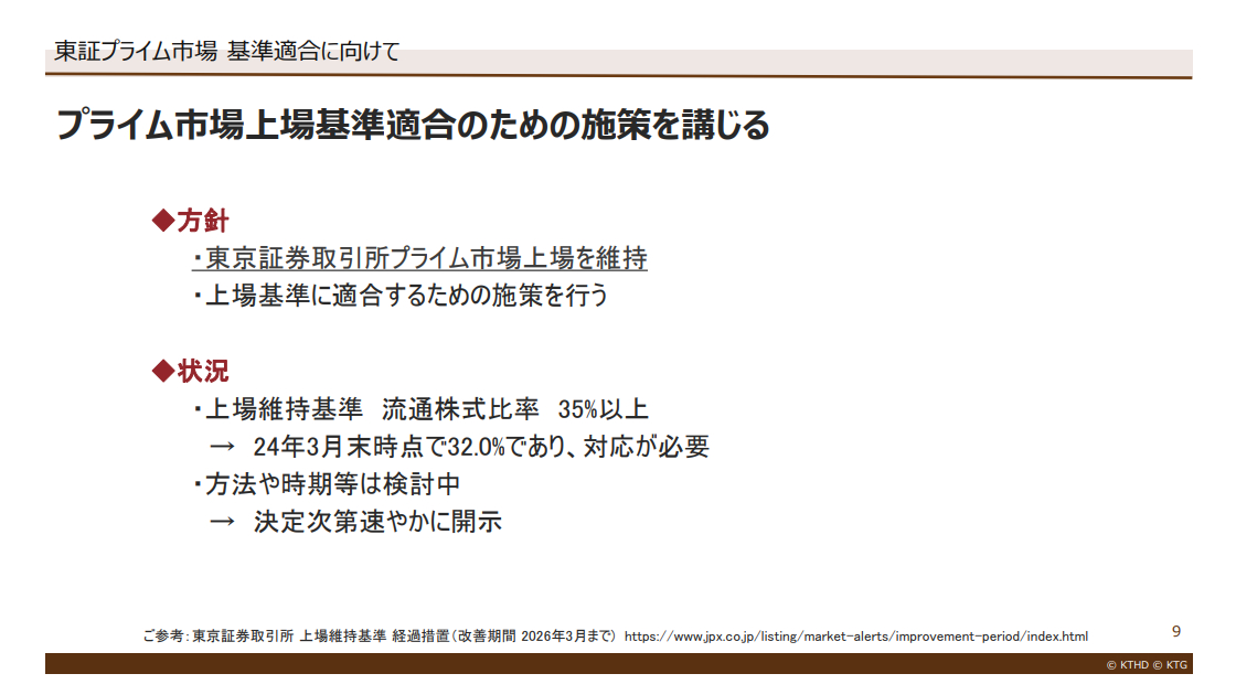 同社は、このうち、流通株式比率が32%で35%以上とする基準をクリアできていないとのこと。
