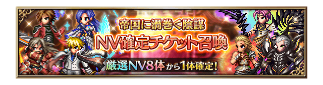 期間限定イベント「帝国に渦巻く陰謀」ボックス召喚から手に入る「NV確定召喚チケット」は厳選NVユニット8体から1体確定で召喚可能。