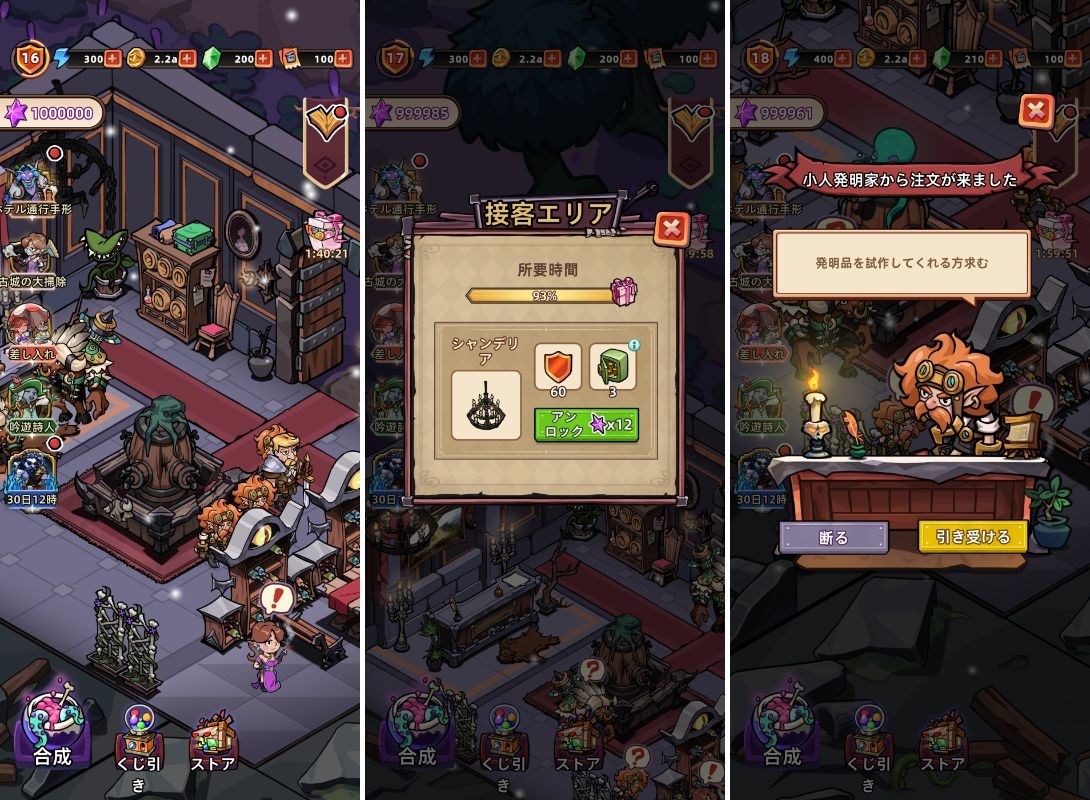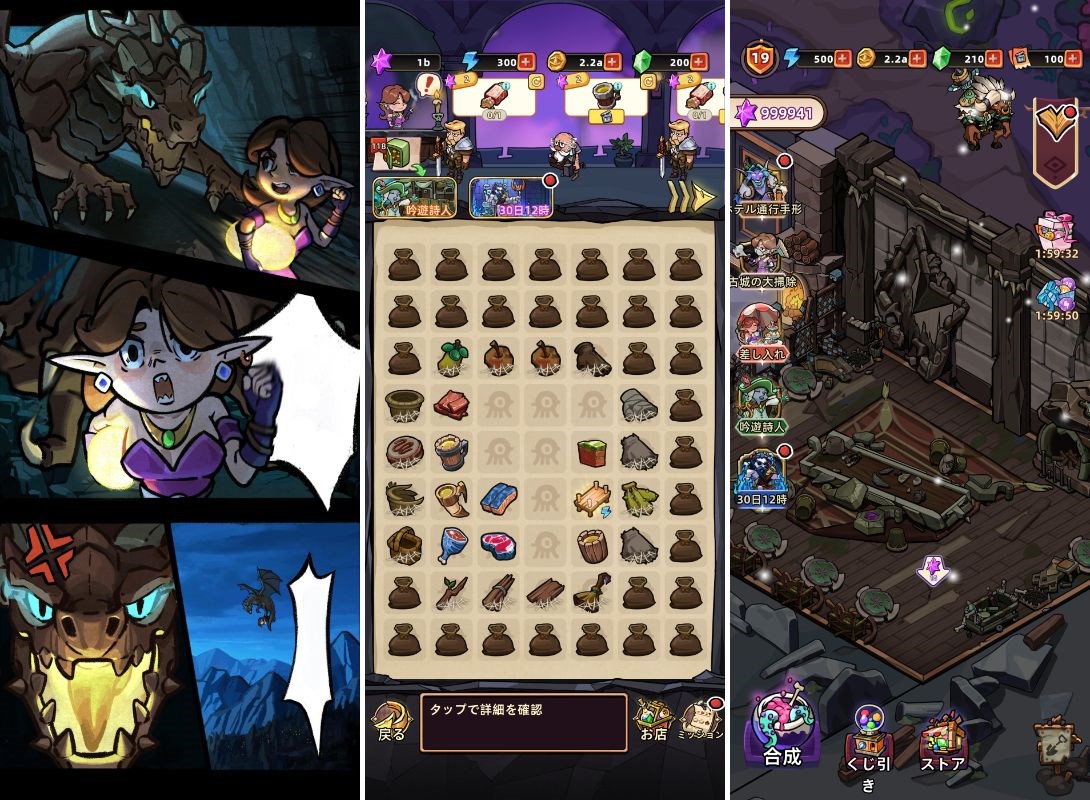 タップするだけで合成革命! ありふれた赤ワインを軽く合わせれば世紀の銘酒が誕生する。また、錆びた剣同士を合成すれば伝説の武具が顕現する。直感でわかる合成システムで、誰でも職人気分になれる。