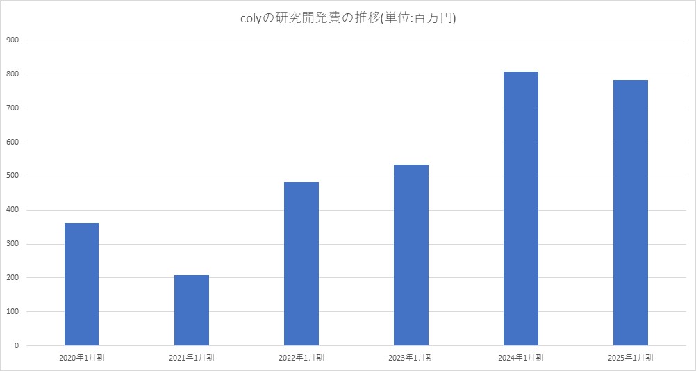 coly<4175>の2025年1月期の研究開発費は、前の期比で3.0%減の7億8400万円だった。前の期(2024年1月期)の実績は、8億0800万円だった。