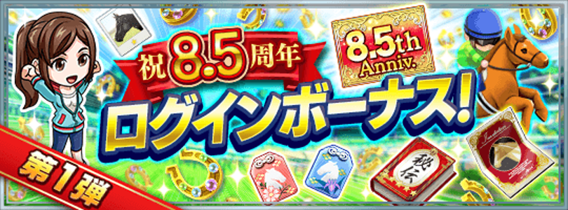 2025年5月1日(木)0:00から2025年6月8日(日)23:59までの期間内にゲーム内にログインすると、「金の馬蹄石」や、「8.5th Anniv.チケット」など育成に役立つ様々なアイテムを獲得できる。