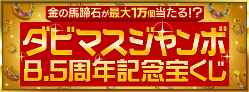 ダービースタリオン マスターズのサービス開始8.5周年を記念して最大1万個の金の馬蹄石が抽選で当たる「ダビマスジャンボ 8.5周年記念宝くじ」を開催。