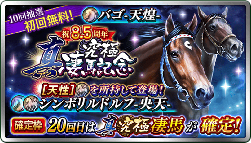 2025年5月1日(木)0:00から2025年5月6日(火)23:59までの期間、真・究極凄馬として新たな天性「洞察」を持つ★5「シンボリルドルフ-央天-」と、★5「バゴ-天煌-」が初登場する「祝8.5周年 真・究極凄馬記念」が開催中。