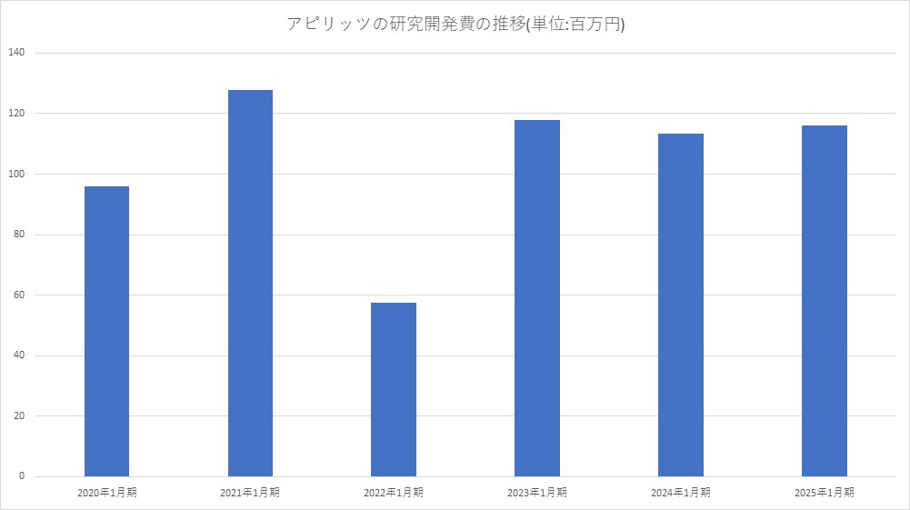アピリッツ<4174>の2025年1月期の研究開発費は、前の期比2.4%増の1億1600万円だった。前の期(2024年1月期)の実績は1億1300万円だった。