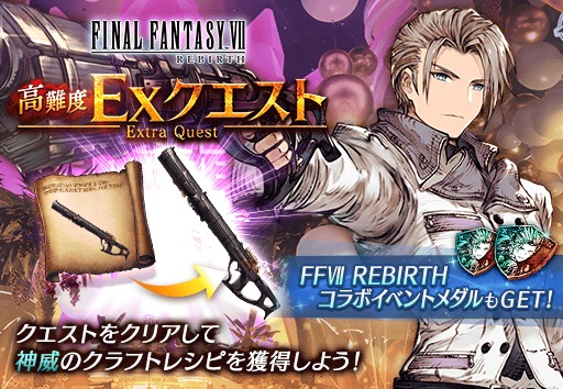 5月1日より、『FFVII REBIRTH』コラボイベントクエストに新たな高難度 EX クエストを追加した。クエストクリアで、コラボ武具 SSR「神威(銃)」のクラフトレシピを獲得できるほか、クリア報酬の「FFVII REBIRTH コラボイベントメダル」を集めると様々なアイテムとの交換が可能。