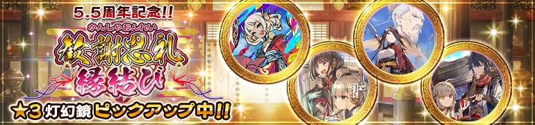 同時開催するガチャ「【大切なあなたに】&【イベント遺跡】特効!英傑 縁結び」では、本イベントで活躍する特効キャラクター「ネコネ[知泉俊英](CV:水瀬いのり)」や描き下ろしの灯幻鏡が登場する。さらに最大550連無料ガチャや5.5周年イベント開始記念として合計「宝珠4000個」のプレゼント等を実施する。