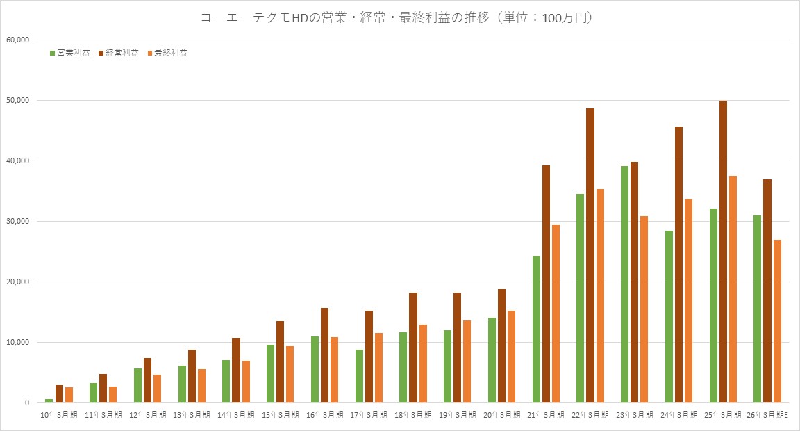 コーエーテクモホールディングス<3635>は、4月30日、2026年3月期の業績について、売上高920億円(前期比10.6%増)、営業利益310億円(同3.5%減)、経常利益370億円(同26.0%減)、最終利益270億円(同28.2%減)、EPS85.49円と増収減益を見込んでいることを明らかにした。