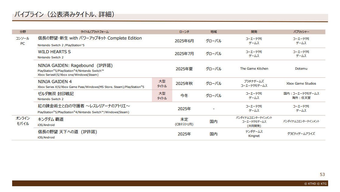 このほか、Nintendo Switch2初参戦タイトル『信長の野望・新生 with パワーアップキット Complete Edition』(25年6月)や『WILD HEARTS S』(25年7月)、『紅の錬金術士と白の守護者 ~レスレリアーナのアトリエ~』(25年中)を発売する。