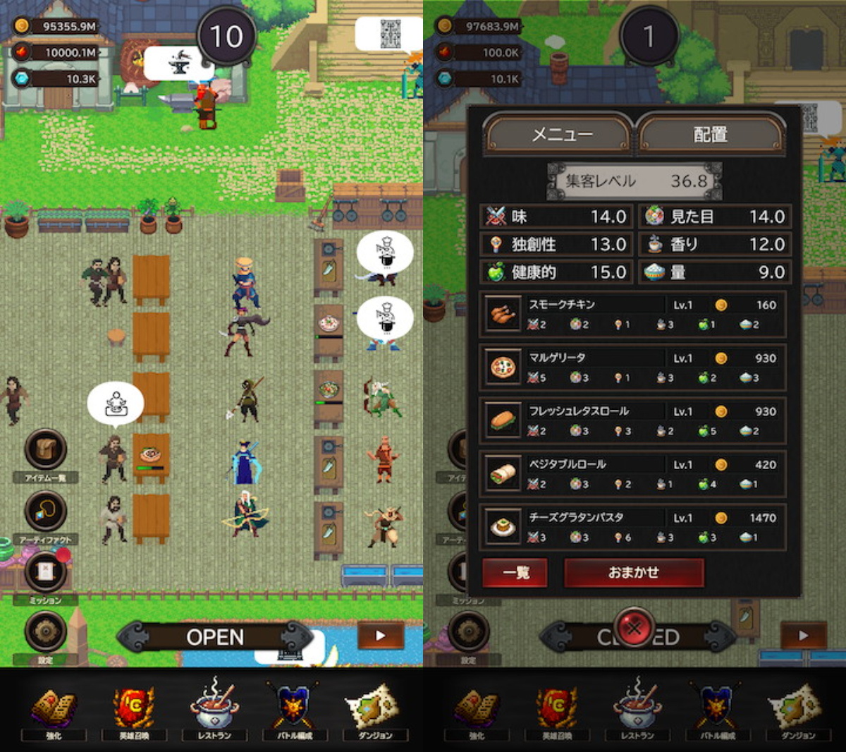 本作は、レストラン経営をしてお金を稼ぎ、キャラクター、装備を強化し、どんどん強くなっていく感覚を楽しむゲーム。バトルはタワーディフェンスバトルとなっており、アクティブスキル、パッシブスキル、装備の組み合わせで自由な戦略を楽しめる。レストラン経営ではメニューの組み合わせが集客に影響し、また限られた座席と設備でスタッフをどう配置するかが経営を左右する。