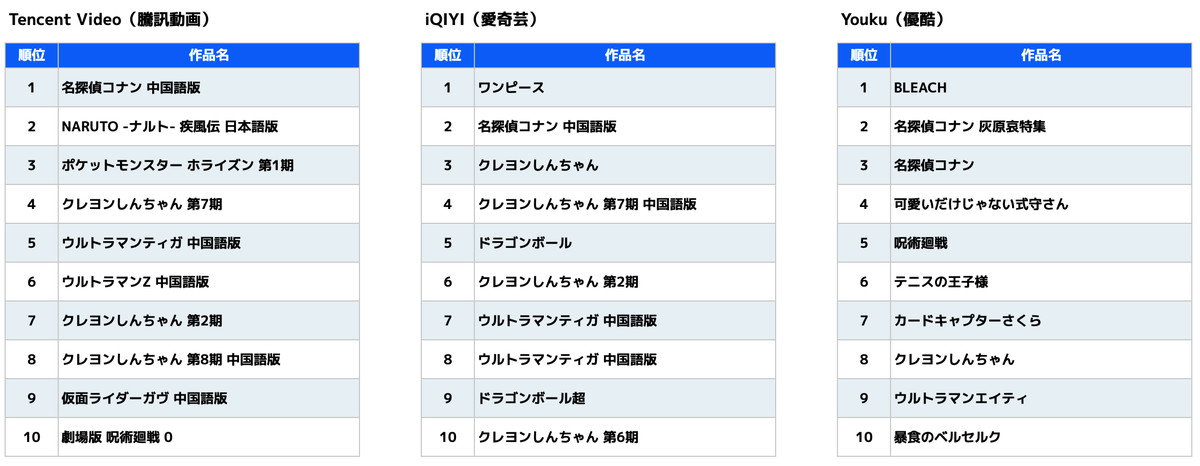 『名探偵コナン』『クレヨンしんちゃん』『ウルトラマン』『ドラゴンボール』など、長く親しまれてきた日本アニメが各社の上位にランクインした。これらのプラットフォームでは中国語吹替版が多くランクインしており、ファミリー層の利用率が高いことがうかがわれる。