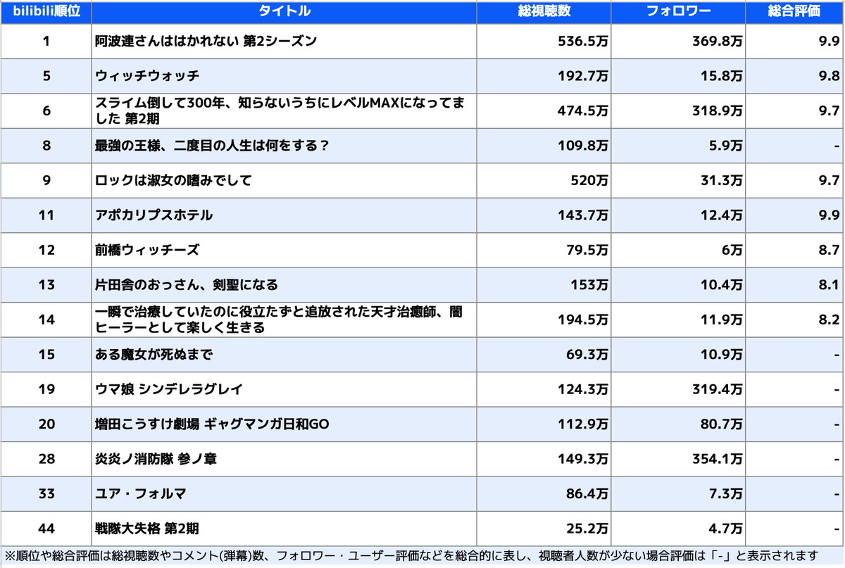 新作のなかでも『阿波連さんははかれない 第2シーズン』『スライム倒して300年、知らないうちにレベルMAXになってました~そのに~』は、累計の総視聴数・フォロワー数・総合評価いずれも高水準を記録。また2025年冬の新作アニメ『俺だけレベルアップな件 Season2』は累計1億回を超える勢いで視聴されている。