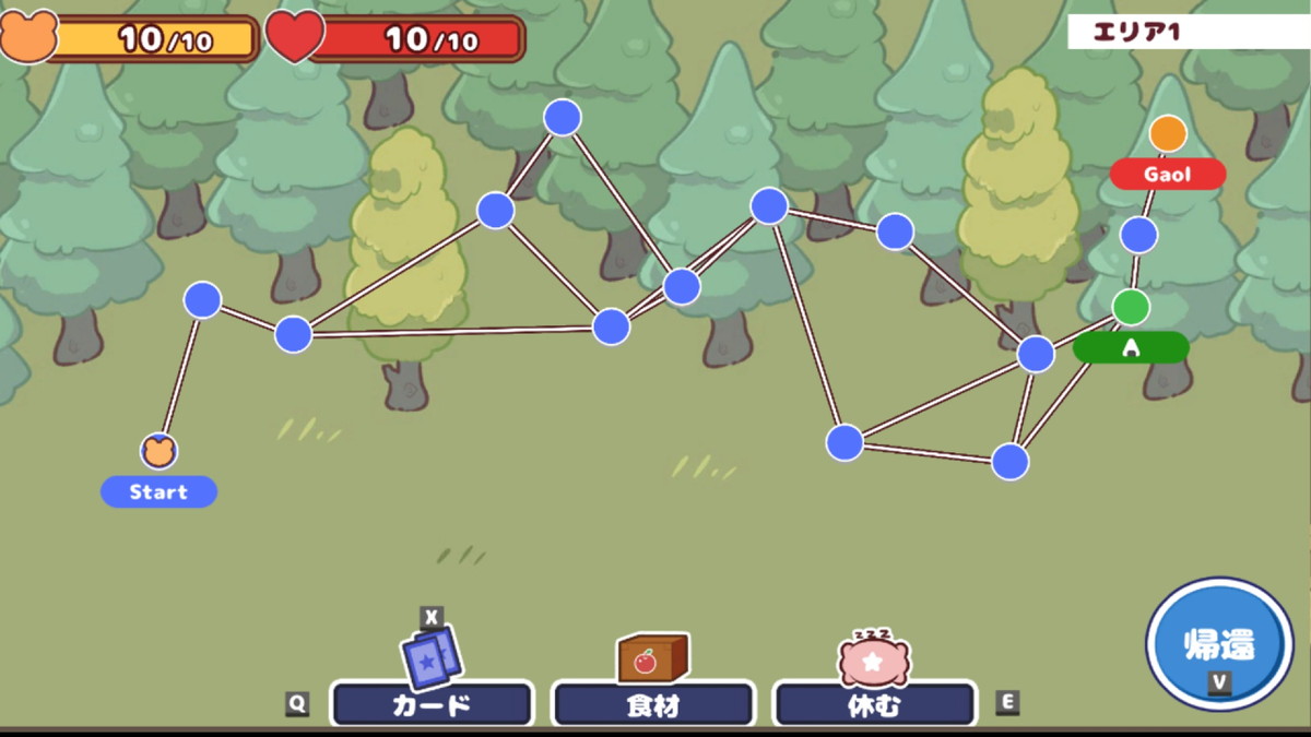 探索は簡易ローグライクでマップを進み、ランダムイベントや野生動物とのバトルで、食材を集める。体力や行動力に注意しながら進む。