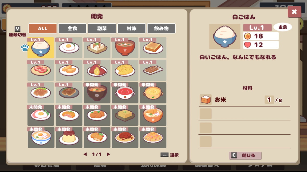 本作は、お手軽な食堂経営シミュレーション。農場や探索で食材を集めて、料理を開発し食堂を経営していく。おいしい料理を作ってお客さんを満足させ、理想の食堂を目指す。