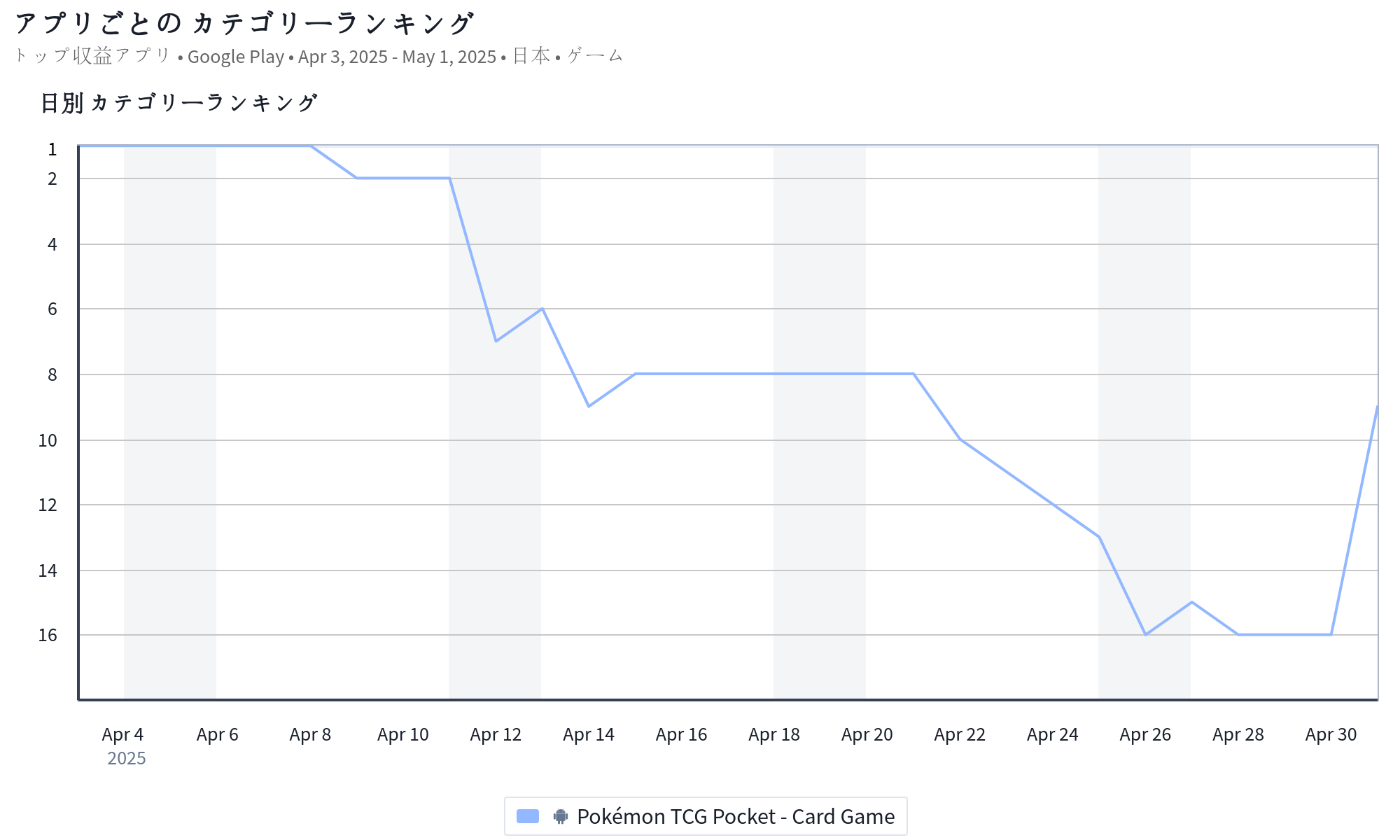 | 16 | ↓1 | Pokémon TCG Pocket | ポケモン/ディー・エヌ・エー(DeNA)<2432> |