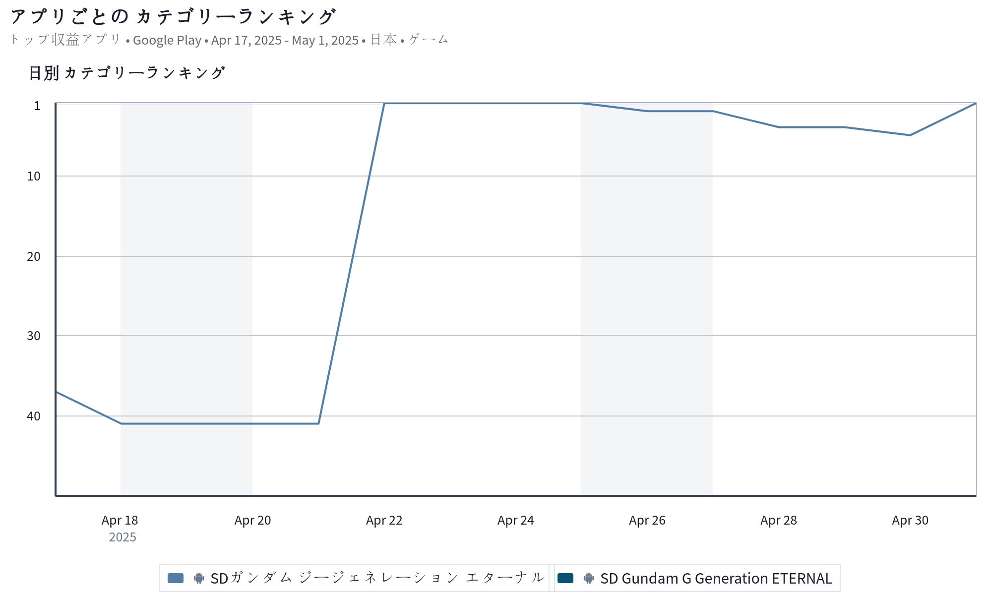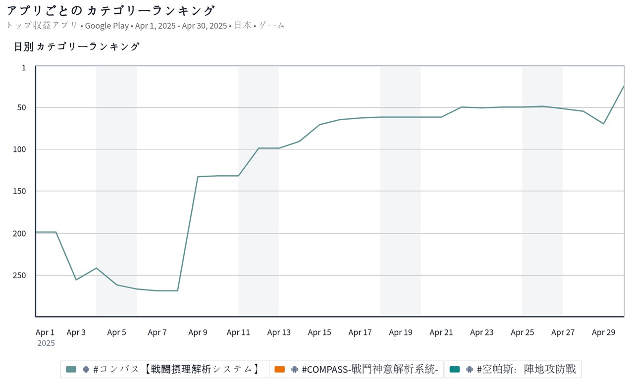 2025年4月26日~5月2日のGoogle Play売上ランキング上位の状況を振り返っていこう。まず、首位争いから見ていくと、『ラストウォー』が7日中5日で首位と強さを示した。ただ、5月に入ると、『SDガンダム ジージェネレーション エターナル』が首位を奪還した。『Pokémon TCG Pocket(ポケポケ)』も2位にランクアップしており、次週は両タイトルによる首位争いが予想される。