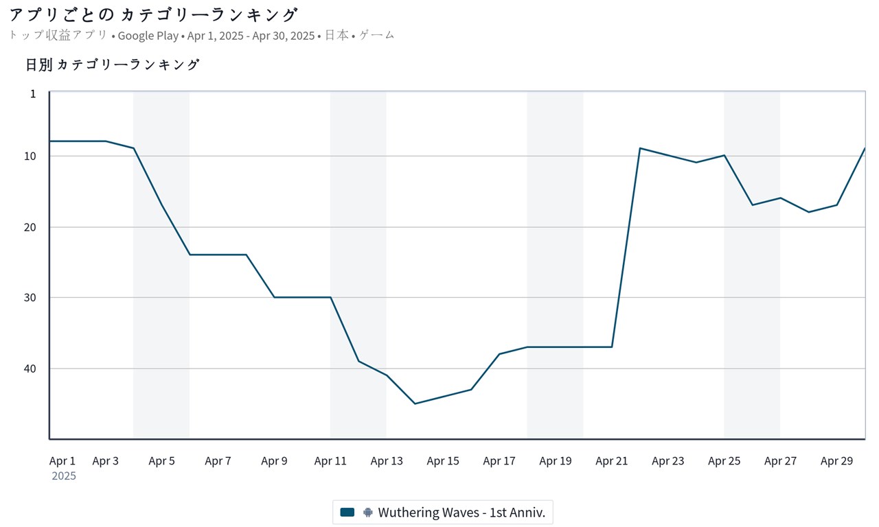 トップ10圏内では、KURO GAMESの『鳴潮(メイチョウ)』が前日の17位から9位に浮上してきた。『鳴潮』は、4月29日にVer2.3「『団』らん祝う焔光と夏唄」を正式リリースしており、星5共鳴者「ザンニー」と星4共鳴者「灯灯」「桃祈」「淵武」の出現率が期間限定でUPした共鳴者集音(イベント)「光と闇の狭間を行く」を実施していることなどが売上に大きく寄与しているようだ。