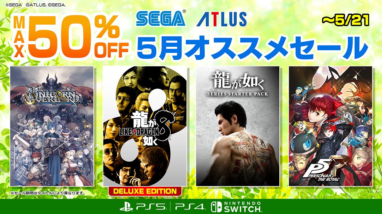 セガは、PlayStation™Storeおよびニンテンドーeショップにて販売中の一部PlayStation®5/PlayStation®4/Nintendo Switch™用タイトルを対象とし、期間限定で特別価格にて販売する「セガ 5月オススメセール」を開催中だ。