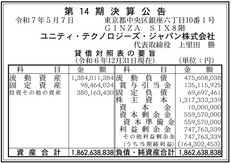 ユニティ・テクノロジーズ・ジャパンの2024年12月期(第14期)の決算は、最終利益が前の期比114.1%増の1億6400万円と大幅増益を達成した。前の期(2023年12月期)の実績は、最終利益7600万円だった。5月7日付の『官報』に掲載された「決算公告」で判明した。