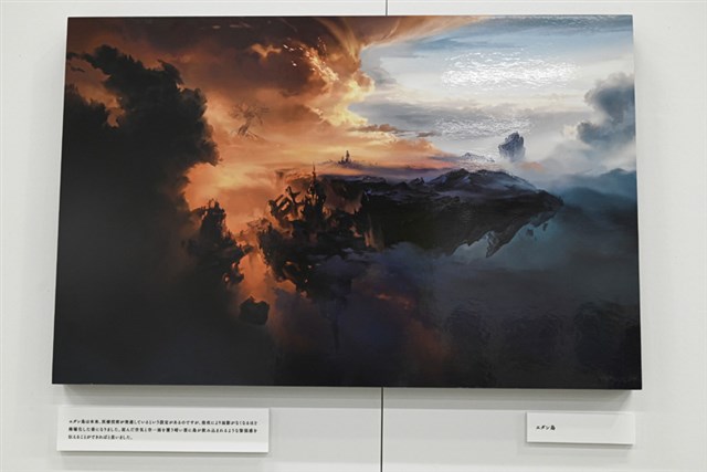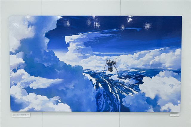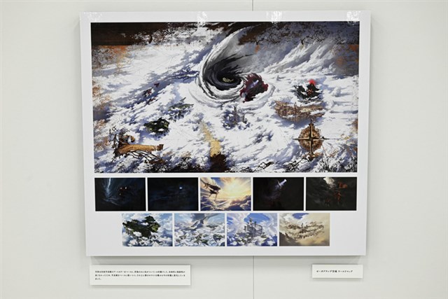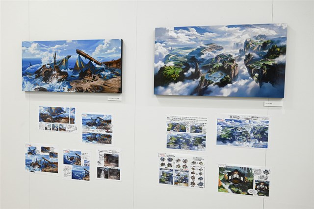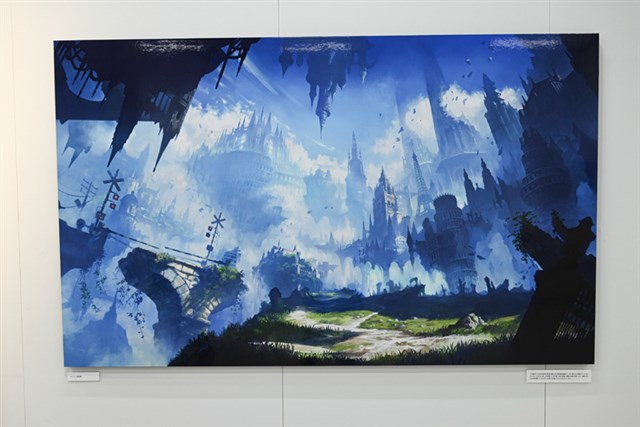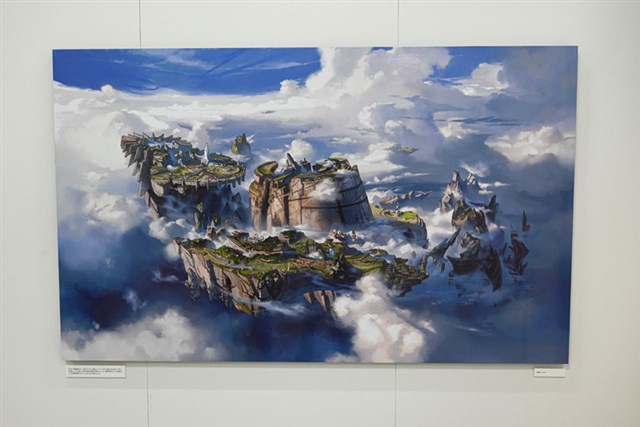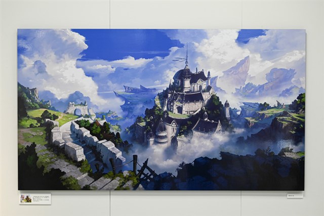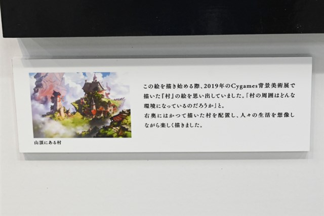 入口では、本展のキービジュアル「雲海を望む大地」が展示されてる。このアートは、2019年に行われた「Cygames背景美術展」で描かれた「村」を思い出し、「村の周囲はどんな環境になっているのだろうか」というイメージで描かれたという。実は、イラストの右奥には”かつての村”が配置されているので、そちらも要注目だ。