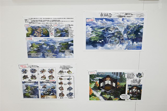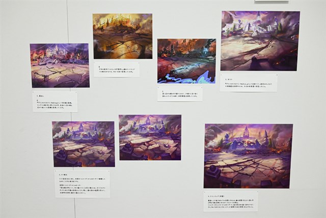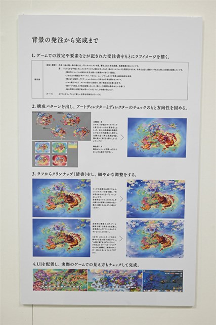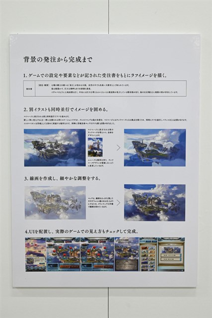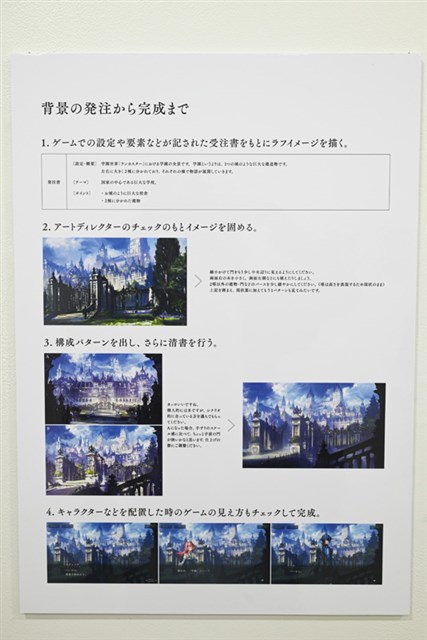 また、発注から完成までの制作プロセス、ラフから完成までの変遷、修正のチェック項目など、普段は社外には公開されないであろう資料も展示されており、ゲーム背景制作の舞台裏を垣間見ることができる。今まで自分がただプレイしていたゲームの背景が、こんなにもクリエイターたちの手が加わっていることを実感した。