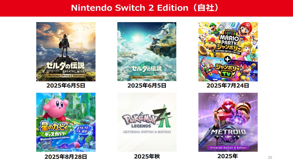 「Nintendo Switch 2 Edition」として発売を予定している自社ソフトは、6月5日に同時発売の『ゼルダの伝説 ブレス オブ ザ ワイルド Nintendo Switch 2 Edition』と『ゼルダの伝説 ティアーズ オブ ザ キングダム Nintendo Switch 2 Edition』、7月24日に発売予定の『スーパー マリオパーティ ジャンボリー』、8月28日に発売予定の『星のカービィ ディスカバリー』、2025年秋発売予定の『Pokémon LEGENDS Z-A』、2025年に発売予定の『メトロイドプライム4 ビヨンド』となっている。