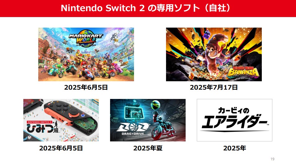 また、Nintendo Switch 2の専用ソフトとなる自社ソフトは、6月5日に同時発売になる『マリオカート ワールド』と『Nintendo Switch 2のひみつ展』、7月17日に発売予定の『ドンキーコング バナンザ』、2025年夏に発売予定の『Drag x Drive(ドラッグ アンド ドライブ)』、2025年に発売予定の『カービィのエアライダー』というラインアップを明らかにしている。