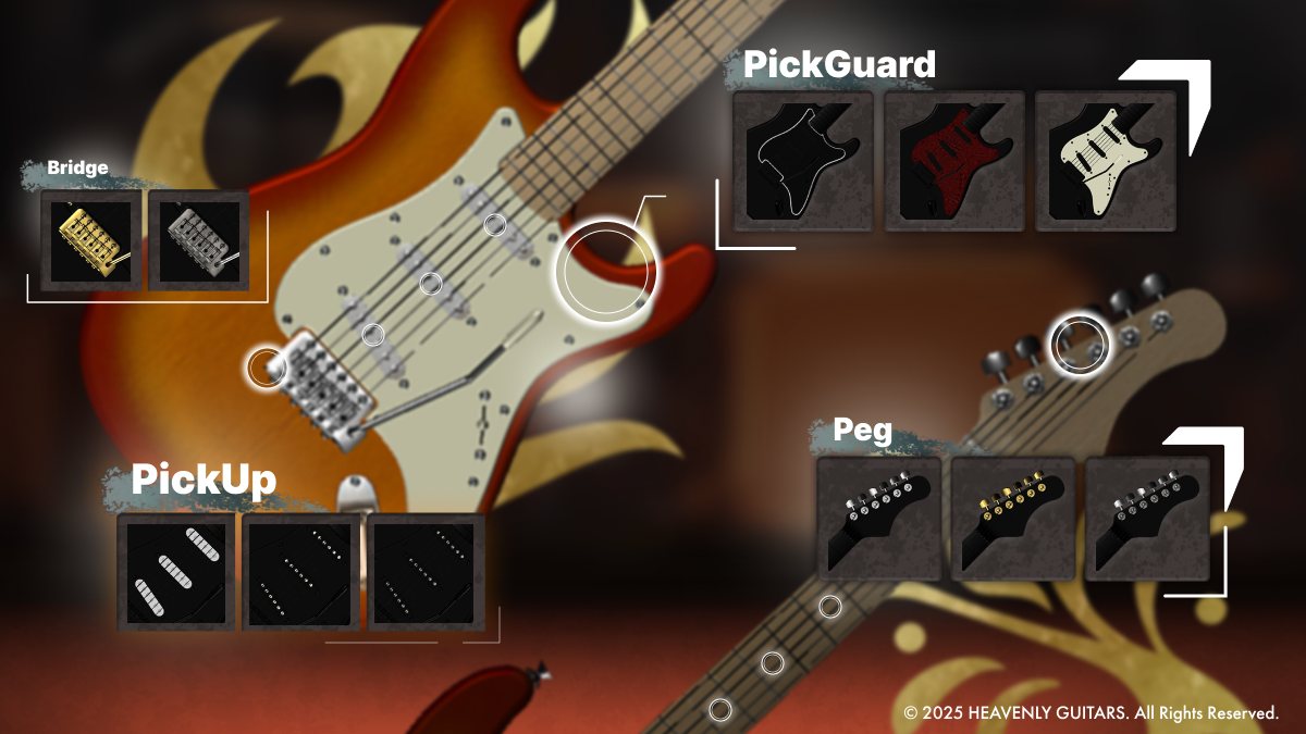ギターの強化だけではなく、ペグやノブ等のパーツ交換や派手なデカールでの装飾、特別なインレイの組み込み等、自分好みのギターを創り上げることが可能。