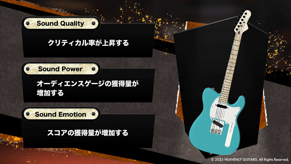 本作には多彩なギターが登場。各ギターは「Sound Quality」「Sound Power」「Sound Emotion」、そして総合力を示す「Guitar Power」といったパラメーターを持ち、ギターのレアリティやレベル、チューンナップ等によって変化する。