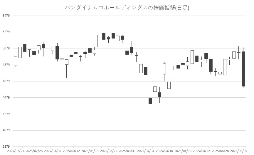 バンダイナムコホールディングス<7832>も後場に入って急落。前場引け後に発表した2025年3月期の連結決算は過去最高業績を更新したが、続く26年3月期通期の業績予想が減収減益で市場の期待を下回ったことが嫌気された。