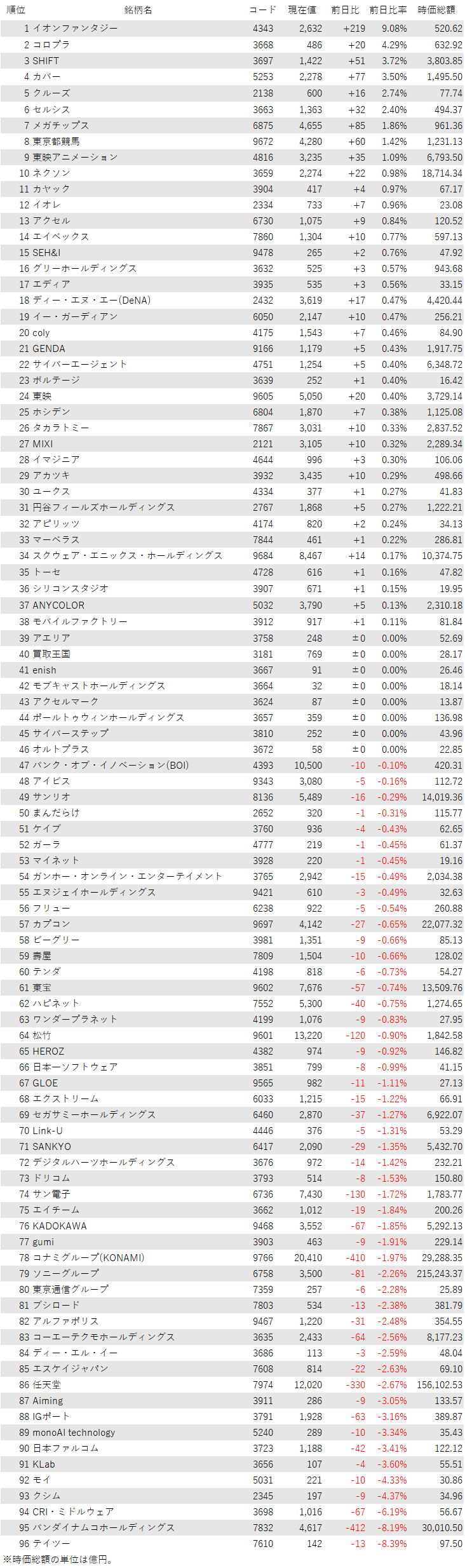 こうしたなか、ゲーム・エンタメ関連企業をみると、登録されている96銘柄のうち、上昇は38銘柄(40%)、下落は50銘柄(52%)、変わらずは8銘柄(8%)で、下落した銘柄の方が多かった。