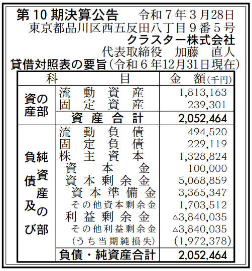 クラスターの2024年12月期(第10期)の決算は、最終損失が19億7200万円と赤字幅が拡大した。前の期(2023年12月期)の実績は、最終損失18億6700万円だった。本日5月9日付の『官報』に掲載された「決算公告」で判明した。