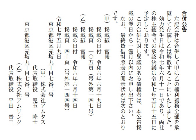電子コミック配信サービス「めちゃコミック」を運営するアムタスは、子会社のアムリンクを吸収合併する。本日5月9日付の「官報」に掲載された「合併公告」によると、合併の効力発生日は6月11日とし、両社の株主総会の決議は5月15日を予定しているとのこと。これに伴い、アムリンクは解散する。