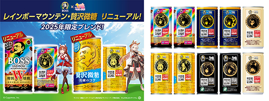 本コラボを記念し、多くのお客様に長年ご愛飲いただいている主力商品5品(「ボス レインボーマウンテンブレンド」「ボス 贅沢微糖」「ボス 無糖ブラック」「ボス カフェオレ」「プレミアムボス」)を「ウマ娘 コラボ缶」として、デザインリニューアル。オリジナルメダル風に仕上がったウマ娘が、各商品の側面にデザインされている。また、「ボス レインボーマウンテンブレンド」は、好評いただいている豊かなコクのある味わいをベースに特別焙煎の豆をブレンドし、コーヒー感を強化した。さらに、「ボス 贅沢微糖」は、コーヒーとミルクのバランスの良い味わいを保ちながら飲みやすさを強化し、洗練されたコクと自然な甘みを楽しめる、限定ブレンドにリニューアル。