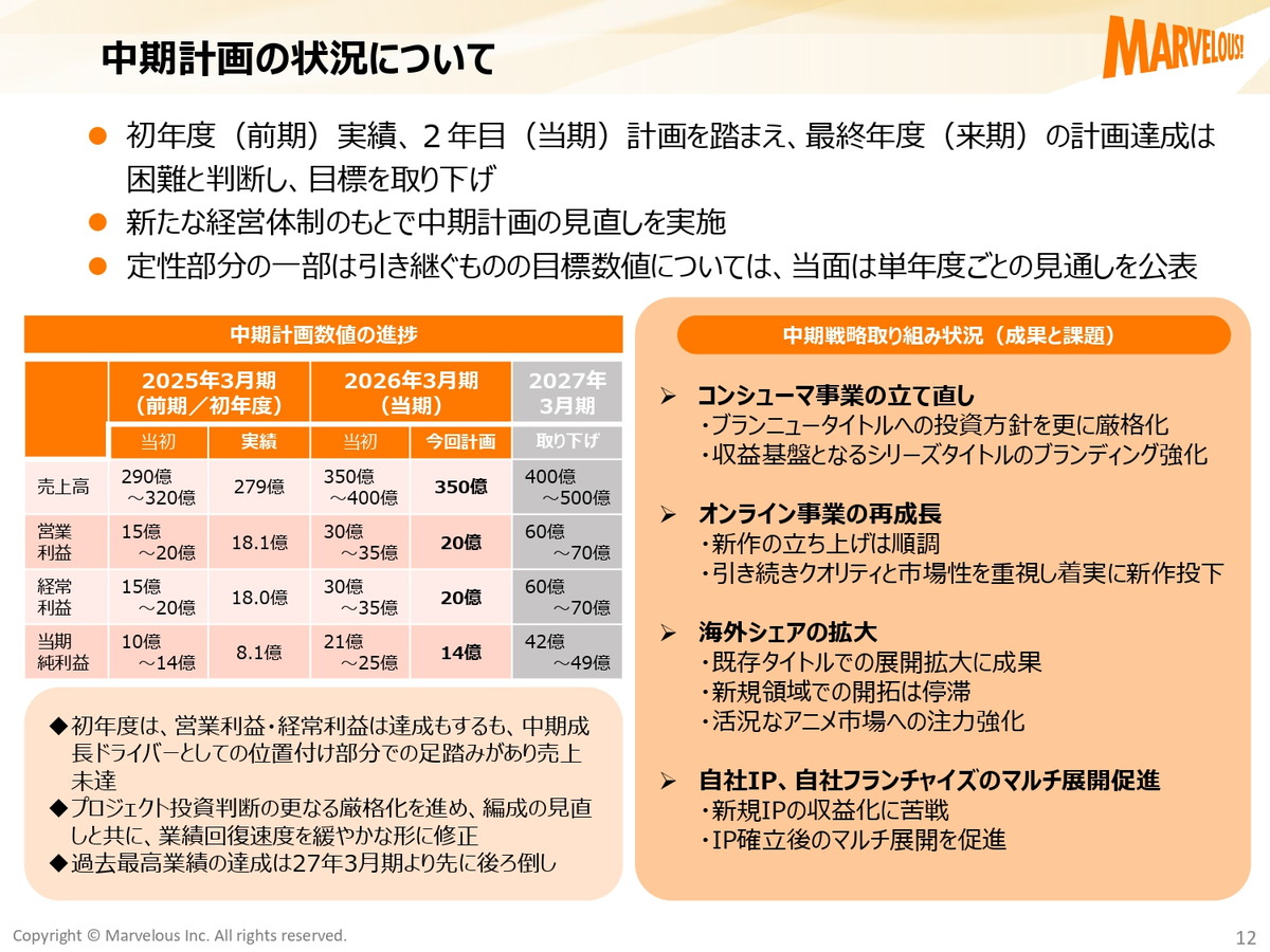 マーベラス<7844>は、2027年3月期を最終年度とする中期計画を取り下げると発表した。初年度であった2025年3月期の実績と2026年3月期の計画を踏まえ、計画達成は困難と判断した、としている。