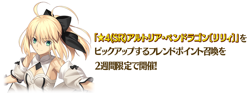 セイバークラスのグランドサーヴァント選定に向けて、「★4(SR)アルトリア・ペンドラゴン〔リリィ〕」をピックアップする「期間限定 アルトリア・ペンドラゴン〔リリィ〕ピックアップフレンドポイント召喚」を開催。「期間限定 アルトリア・ペンドラゴン〔リリィ〕ピックアップフレンドポイント召喚」における「★4(SR)アルトリア・ペンドラゴン〔リリィ〕」の召喚確率は、通常のフレンドポイント召喚の 3 倍となっている。