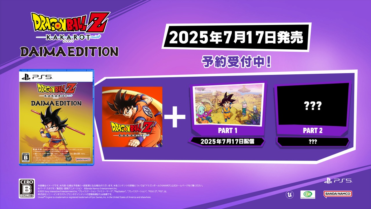 また、『ドラゴンボールZ KAKAROT』ゲーム本編と最新DLC「-DAIMA- 魔界の大冒険! パック」がセットになった「DAIMAエディション」も、同じく2025年7月17日に発売する。さらに、PlayStation5パッケージ版の「DAIMAエディション」の予約受付を、5月12日より順次開始する。