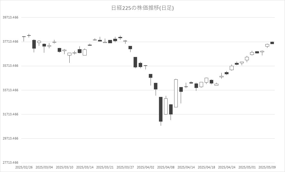 5月12日前場の東京株式市場は3日続伸。日経平均株価は、前営業日比16円47銭高の3万7519円80銭で午前中の取引を終えた。米中貿易協議への期待や為替の円安基調を手がかりに買い優勢で始まり、一時223円高まで買われる場面があったが、テクニカル的な過熱感が意識され、買い一巡後は上げ幅を縮小した。