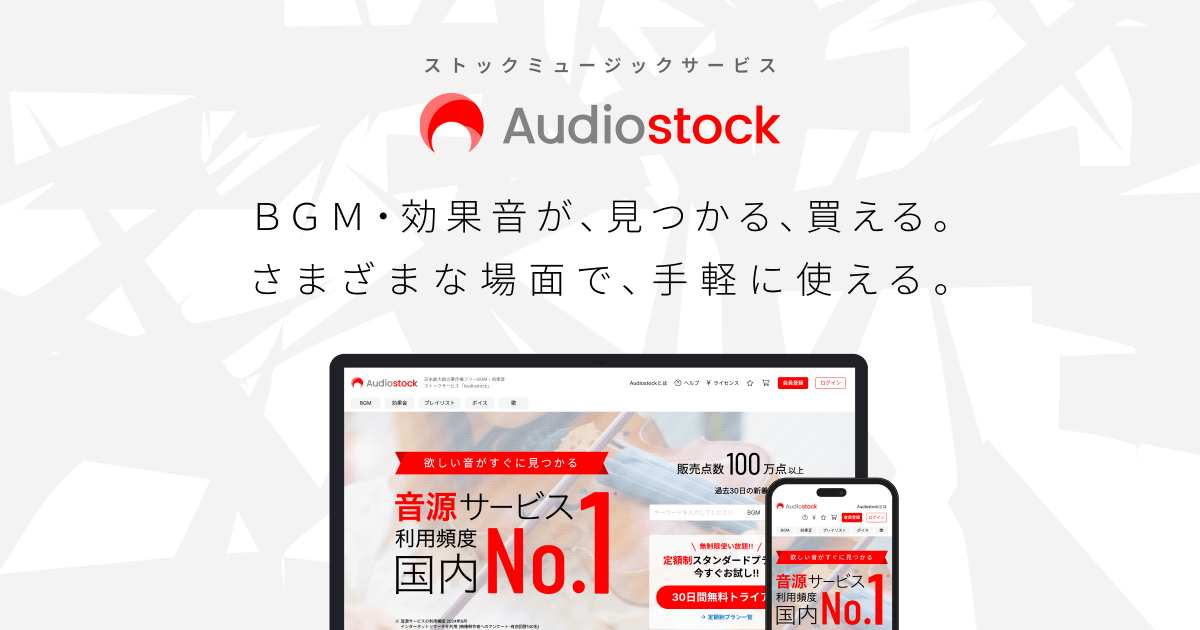 「Audiostock」は音楽の使用ライセンスを売買できるサービス。音楽クリエイターは自身で制作した音楽を登録して使用権を販売することができ、売上に応じた印税を受け取ることができる。顧客は単品購入またはサブスクリプション方式で購入手続きを行うだけで音楽の利用許諾を得ることができ、映画・テレビ・YouTube・広告・SNS投稿動画・アプリ・ゲーム等の商用コンテンツに音楽を組み込むことができる。