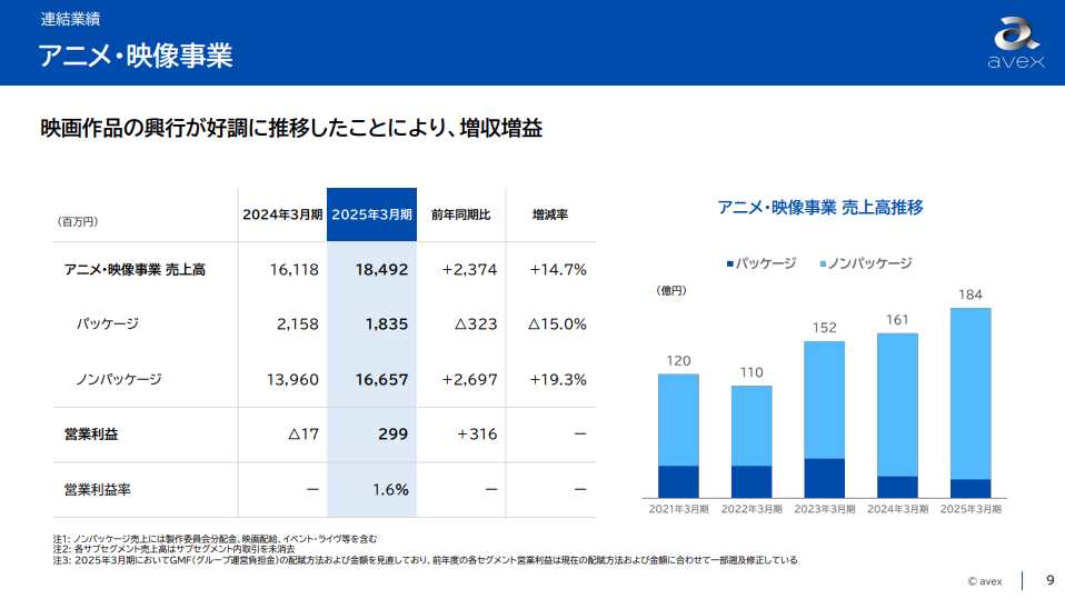 エイベックス<7860>は、2025年3月期の決算で、アニメ・映像事業の売上高が前の期比14.7%増の161億1800万円、営業利益が2億9900万円(前の期は1700万円の損失計上)と2ケタ増週・黒字転換したことを明らかにした。