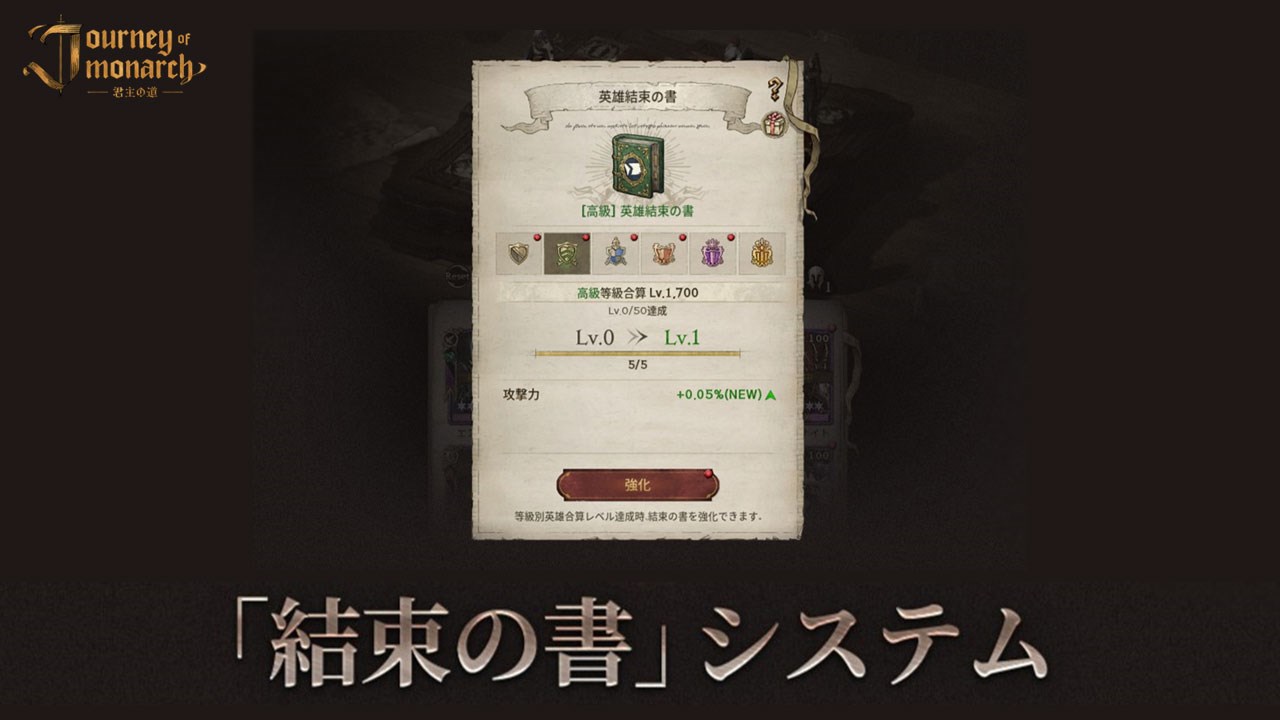 英雄/マジックドールそれぞれの等級別の合算レベルが一定値に到達するたびに強化できるコンテンツ「結束の書」を実装した。「結束の書」はメニューの「英雄」>「英雄またはマジックドール」画面内右上のボタンから確認することができ、強化することで等級別に異なる追加ステータスや別途の報酬アイテムを獲得することができる。なお、レベル初期化アイテムなどによって合算レベルが減少する場合、「結束の書」のレベルも減少することがある。