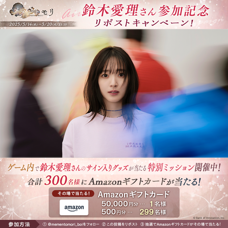 【応募方法】 メメントモリ公式 X アカウント(@mementomori_boi)をフォローし、対象の公式ポストをリポストすると、抽選で300 名に Amazon ギフト券コードが当たる。抽選結果は、『メメントモリ』ゲーム内お知らせよりその場で確認できる。